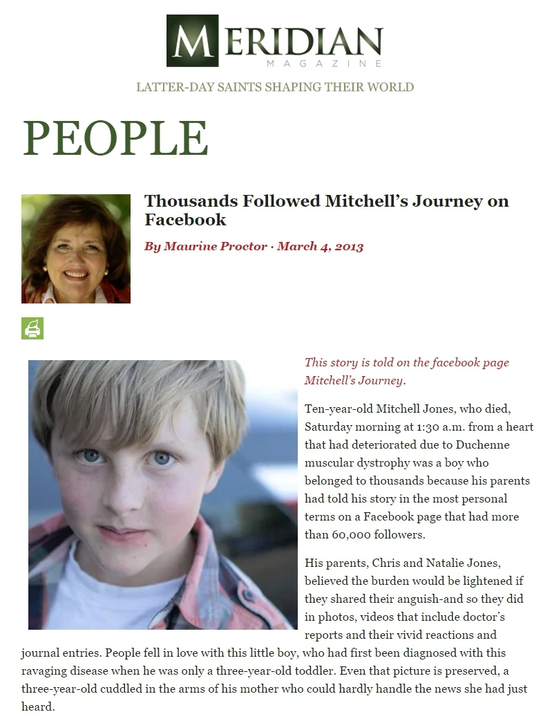 Ten-year-old Mitchell Jones, who died, Saturday morning at 1:30 a.m. from a heart that had deteriorated due to Duchenne muscular dystrophy was a boy who belonged to thousands because his parents had told his story in the most personal terms on a Facebook page that had more than 60,000 followers.