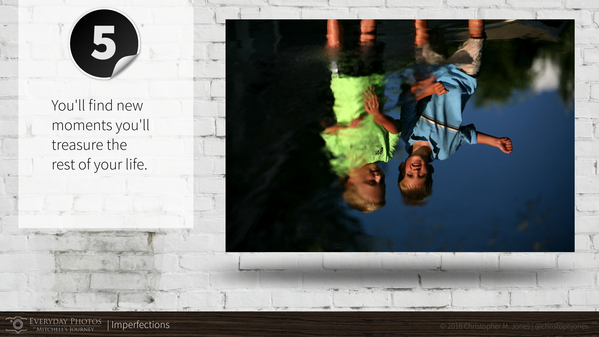 Today, focus on taking photos of life's imperfections. If you have children, take photos of their rooms. Pay close attention to the little collections they make, the treasures they stash away and the messes they leave behind. Each of those tell stories - and if you look closely, they will tell stories within stories. Take a lot of photos; close up, medium and far away. If you have a significant other, take photos of them just living life. Don't try to capture perfection - capture the imperfections... the moments in between moments.