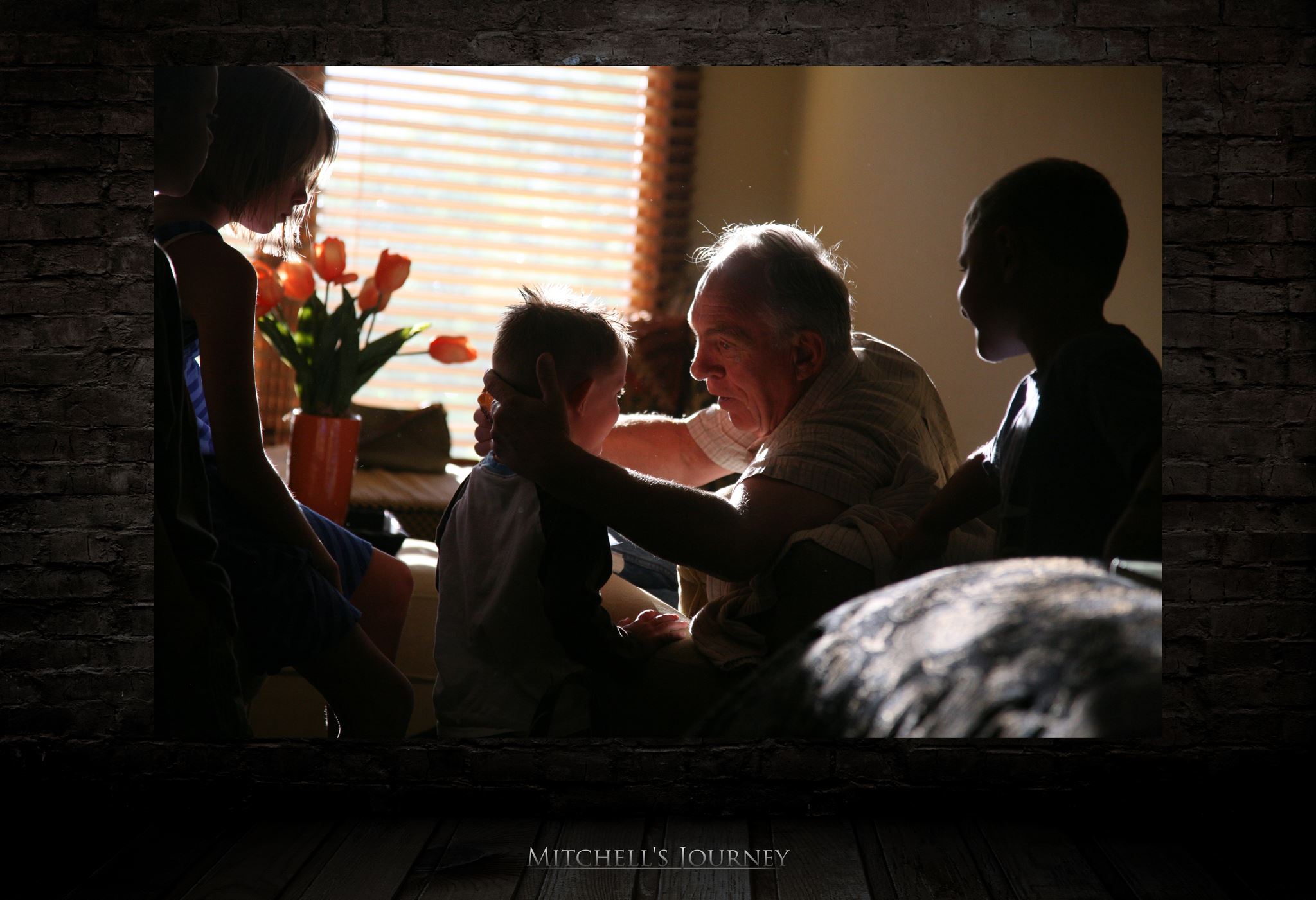It was summer and the color of the evening sun had poured into the room like a glass of warm orange juice. Grandpa hiked his pant legs a little as he sat down to tell my small children some tall tales. My little ones sat around him (Mitch on the right), captivated and smiling as their grandfather lovingly wove a story of fiction, magic, and a little bit of nonsense.