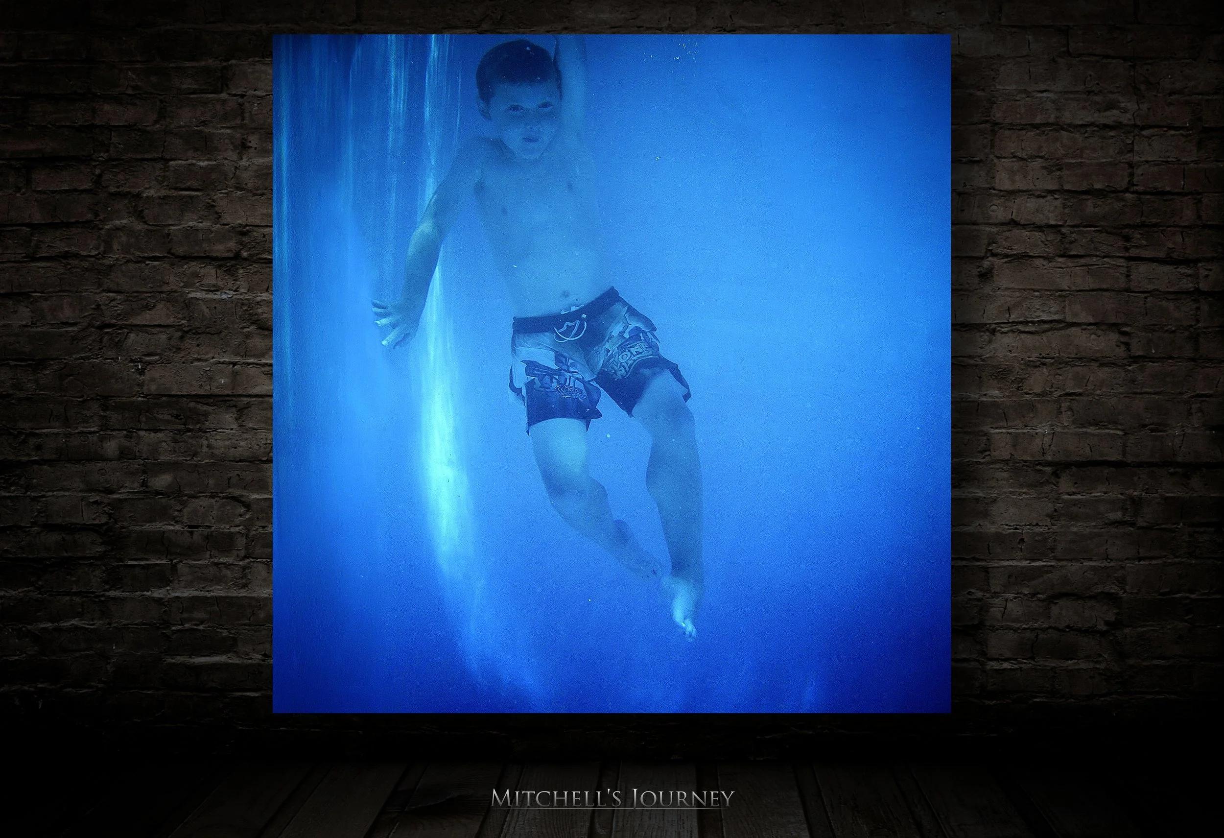When he was a toddler, tiny Mitch would cause lifeguards to panic because he dove under the water, held his baby breath, and swam like a little fish for long periods of time. None of the other kids his size did anything like unto him, and because he behaved so irregularly, they often worried he was drowning. As Mitch grew older, he didn't have the muscle strength to swim like he used to, so he would go to the deep end and sink as far as he could. On this occasion, I captured his expression while under the surface. It was then and remains today, a magical thing to see.