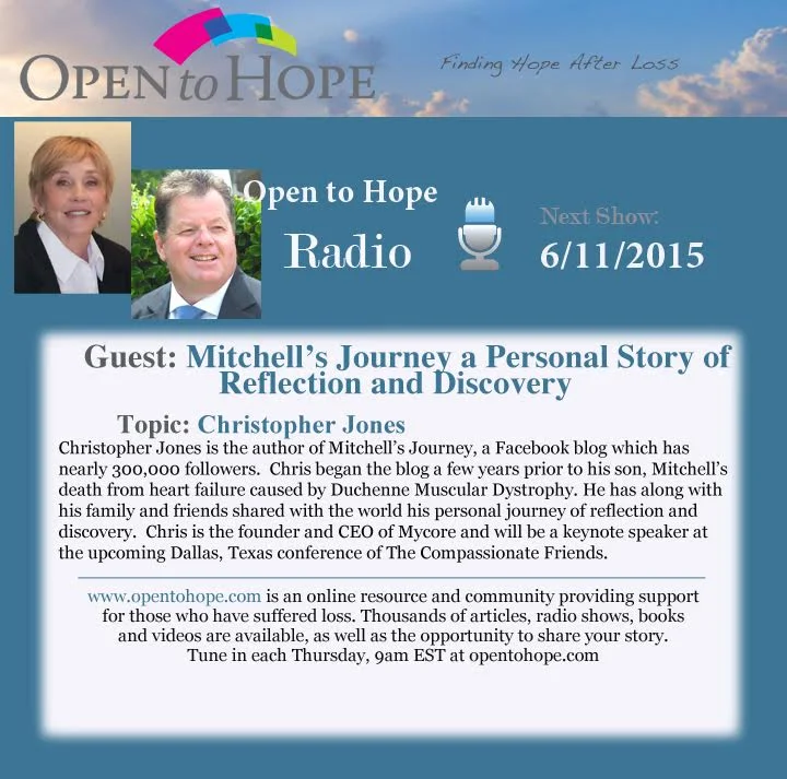 It was an honor to be interviewed by Dr. Gloria Horsely on her nationally syndicated radio show, Open to Hope. That interview can be heard on their website or in the audio page of the Mitchell's Journey website.