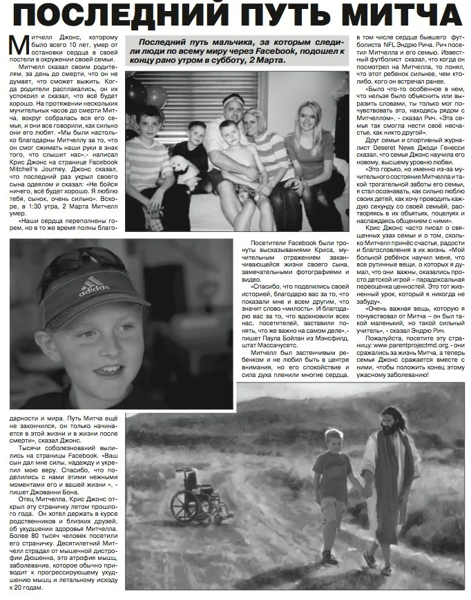 Mitchell Jones, 10, died March 2, 2013, of Duchenne muscular dystrophy (DMD). He left behind his parents, siblings, extended family and friends and more than 300,000 worldwide followers of “Mitchell’s Journey” on Facebook. Later this year, Jones will be releasing a book based on the essays he posted.