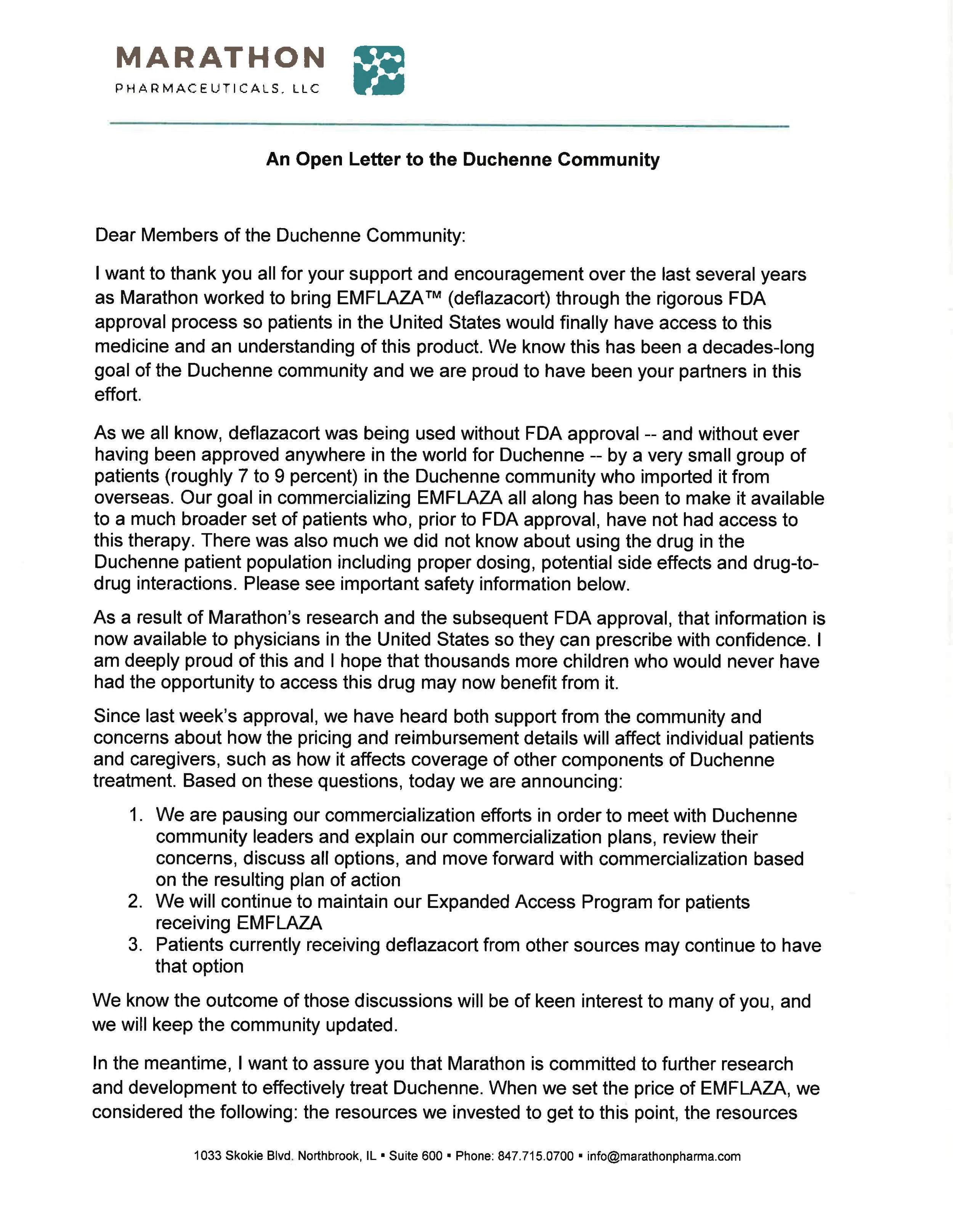 Two pharmaceutical companies, Sarepta and Marathon, presented updates on medicines for DMD patients. Because of several controversial issues around pricing, Marathon was under pressure to explain their pricing model for a product that had essentially been on the market for ~40 years. In an effort to slow down and hear customers, the CEO of Marathon sent Pat Furlong an email with a temporary measure aimed at allaying concerns about an immediate price hike for US patients who needed the medication.