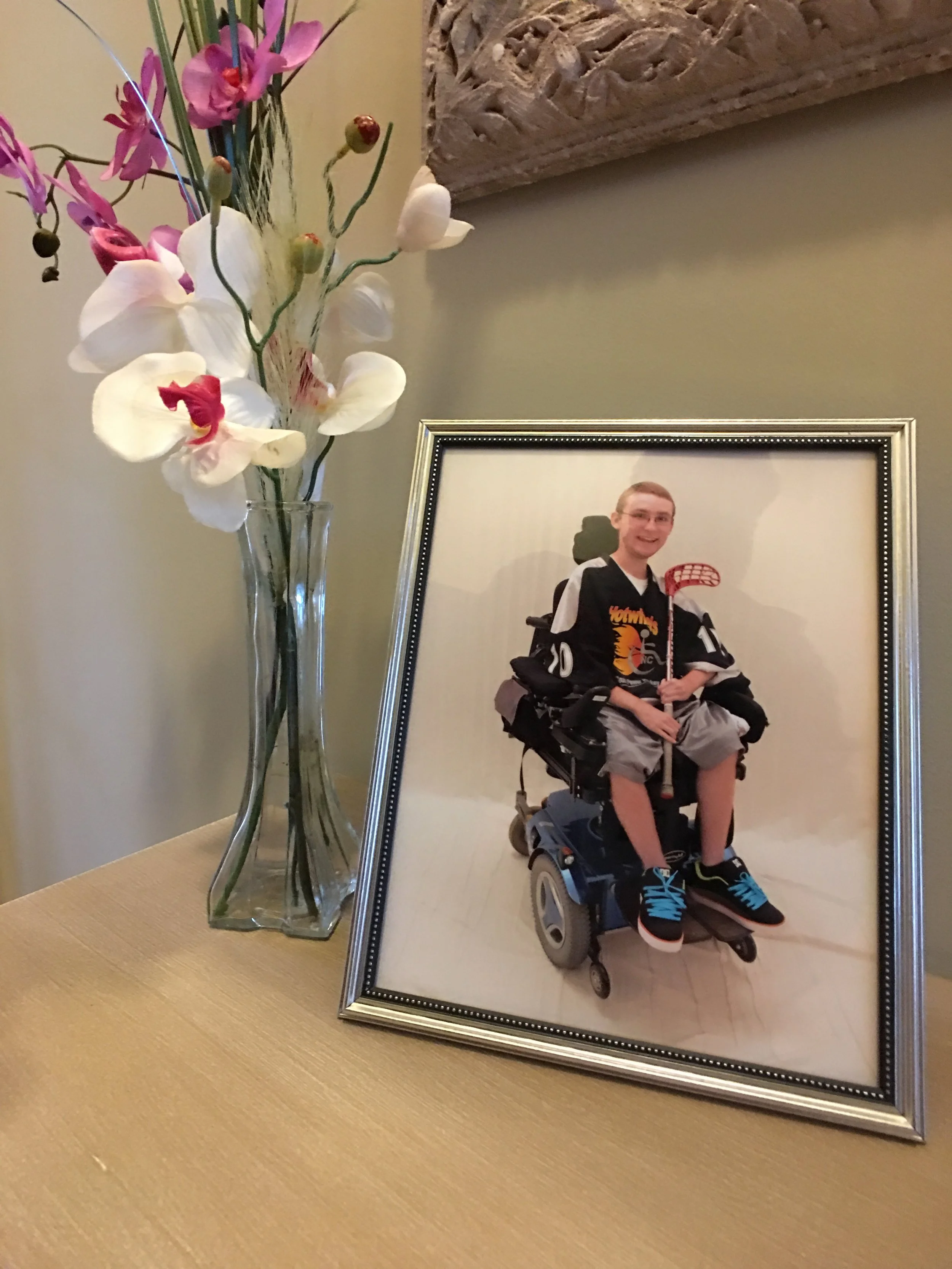 In their foyer, a photo of son, Justin. He was an intelligent, vigrant young man who loved playing adaptive floor hockey, video games and loved to pursue girls.